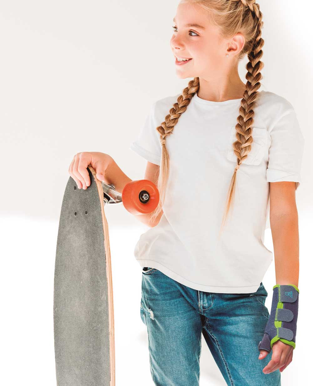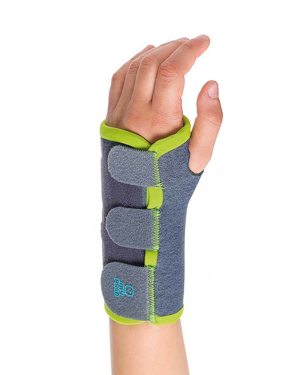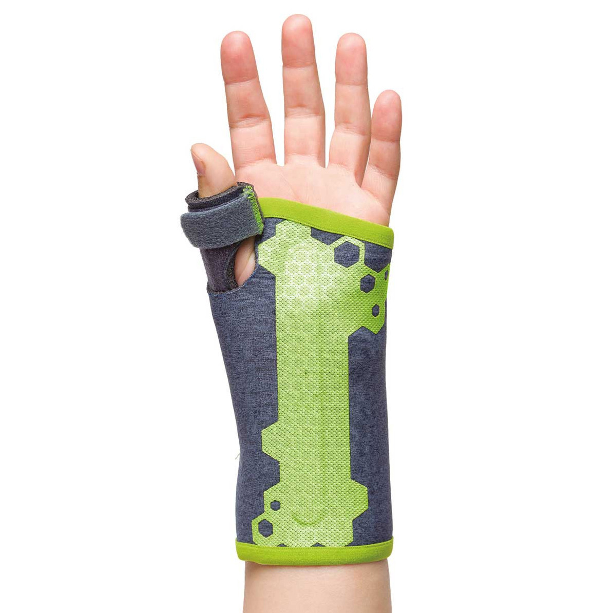 Ortoza për kyçin e dorës nga materiali elastik që përshtatet në mënyrë perfekte me dorën. Materiali e lejon lëkurën të marrë frymë dhe është i veshur me material sfungjeri për rehati më të madhe. Ekziston një shirit alumini që siguron imobilizimin e nevojshëm të kyçit. Ortoza ka një pjesë shtesë të veçantë për imobilizimin e gishtit të madh. I punuar nga i njëjti material me një shirit alumini që e imobilizon nyjën e gishtit të madh. Rekomandohet për fëmijët e moshës 2 deri në 12 vjeç.