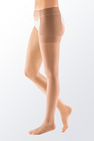 Mediven Plus CCL3 со waist attachment е медицински компресивен чорап (над колено) со прицврстување на струк (појас), наменет за силна компресија и сигурно фиксирање без лизгање. Овој модел е идеален за пациенти со напредни венски состојби, бидејќи обезбедува стабилен притисок долж целата нога и дополнителна сигурност при носење. Mediven Plus линијата е позната по својата издржливост, анатомско прилегање и непрозирен изглед кој дискретно ги покрива вените и неправилностите на кожата.