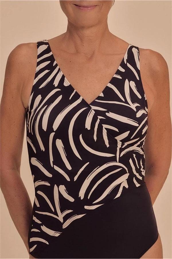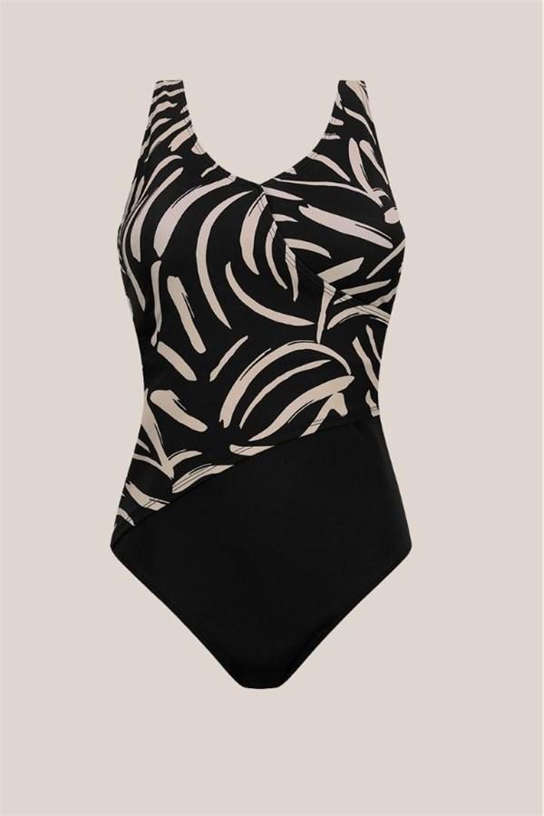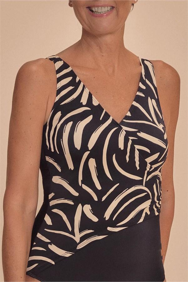 Изработен со LYCRA® XTRA LIFE™ влакна за долготрајно задржување на формата и висока отпорност на хлор. Моделот е со дезен во земјени тонови во комбинација со црна боја. Материјалот нуди UV заштита 50+ за чувствителна кожа и лузни.