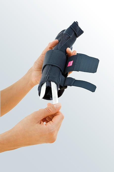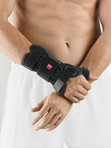 Ортоза Манумед со метална лента за имобилизација на рачен зглоб и палец. Со носење на ортозата се намалува отокот, воспалението и болката при повреди на зглобот.