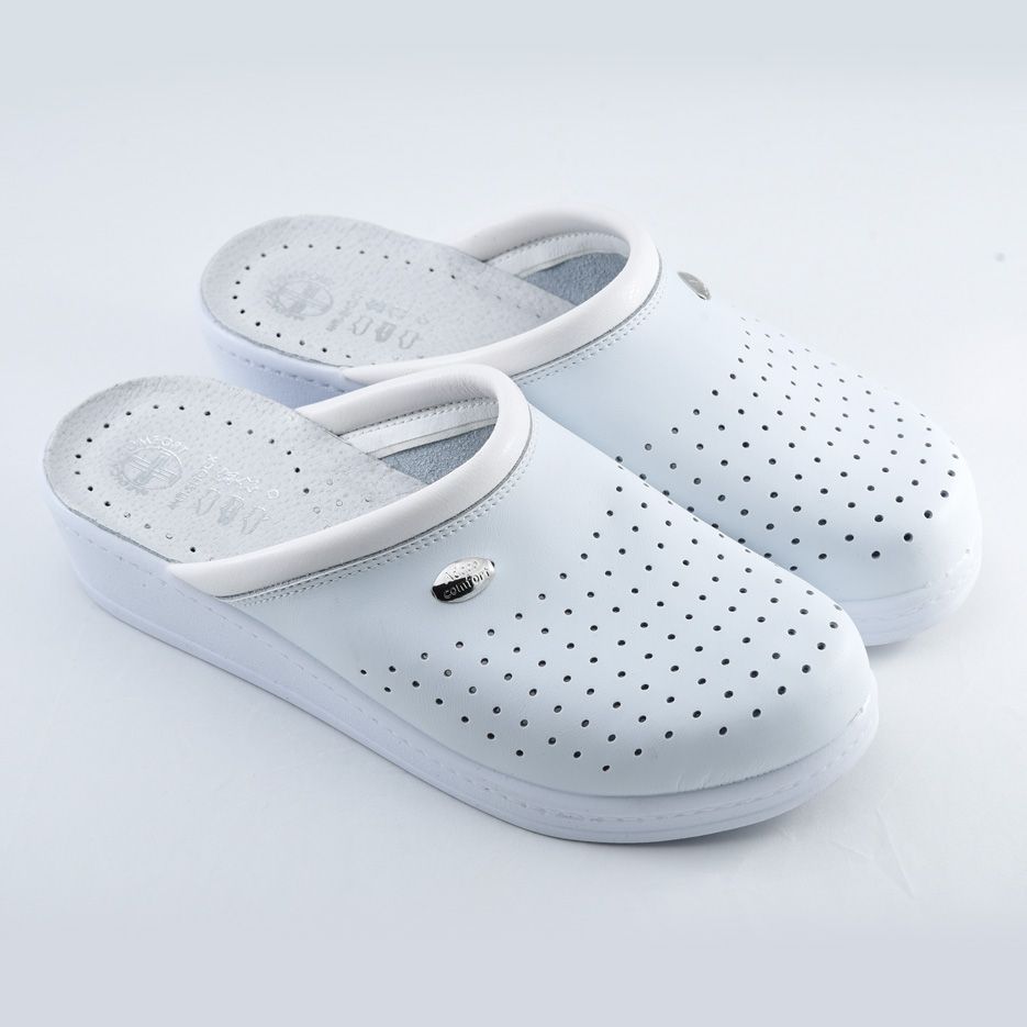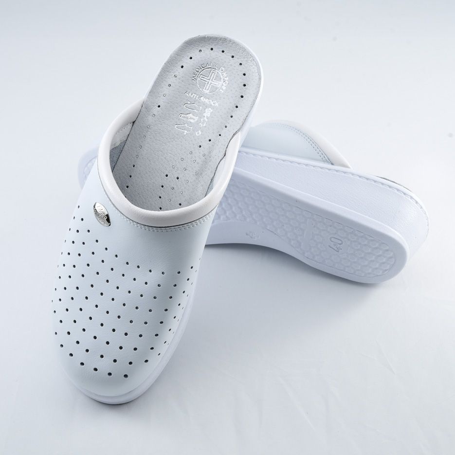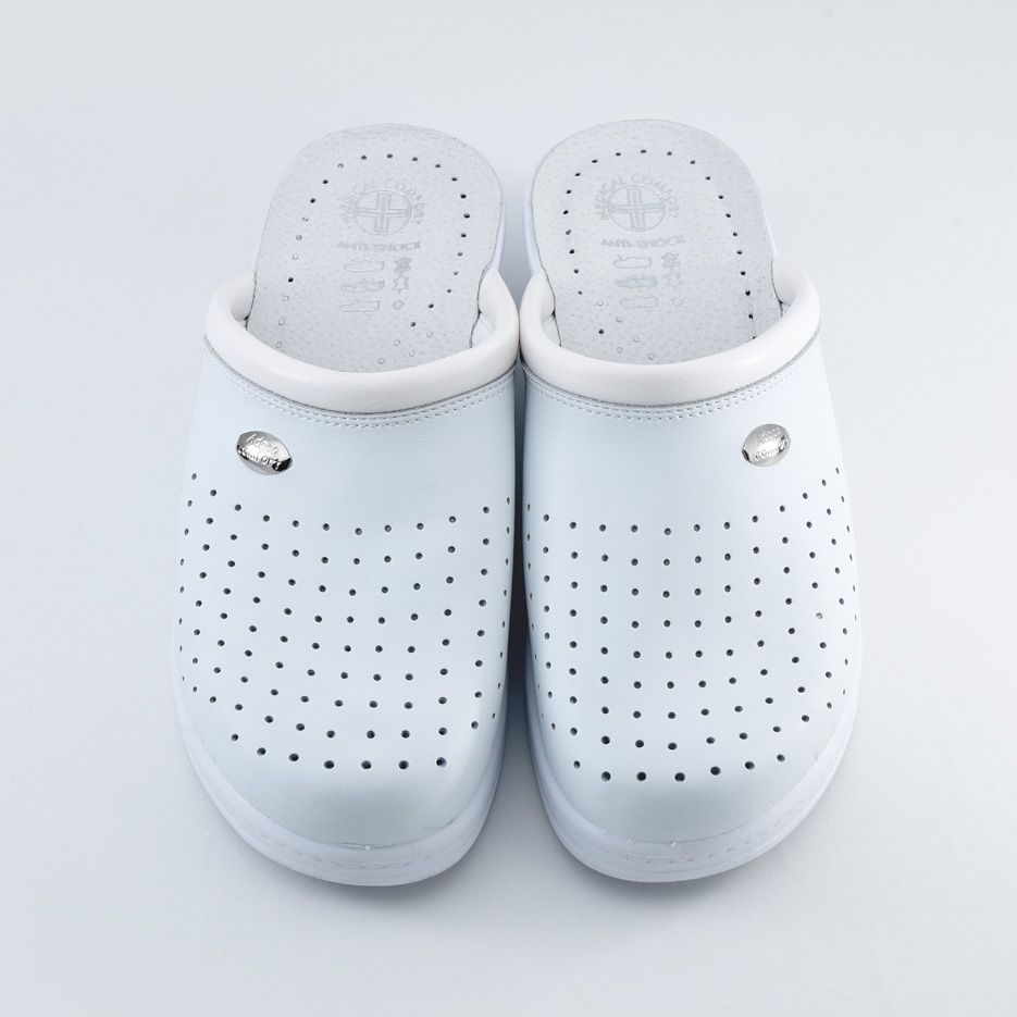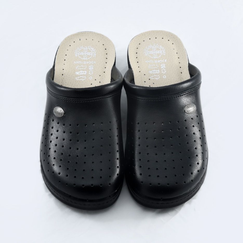 Кожни анатомски кломпи со анатомско лежиште. Во самата основа имаат вградено анти-шок перниче кое го амортизира притисокот на петата.