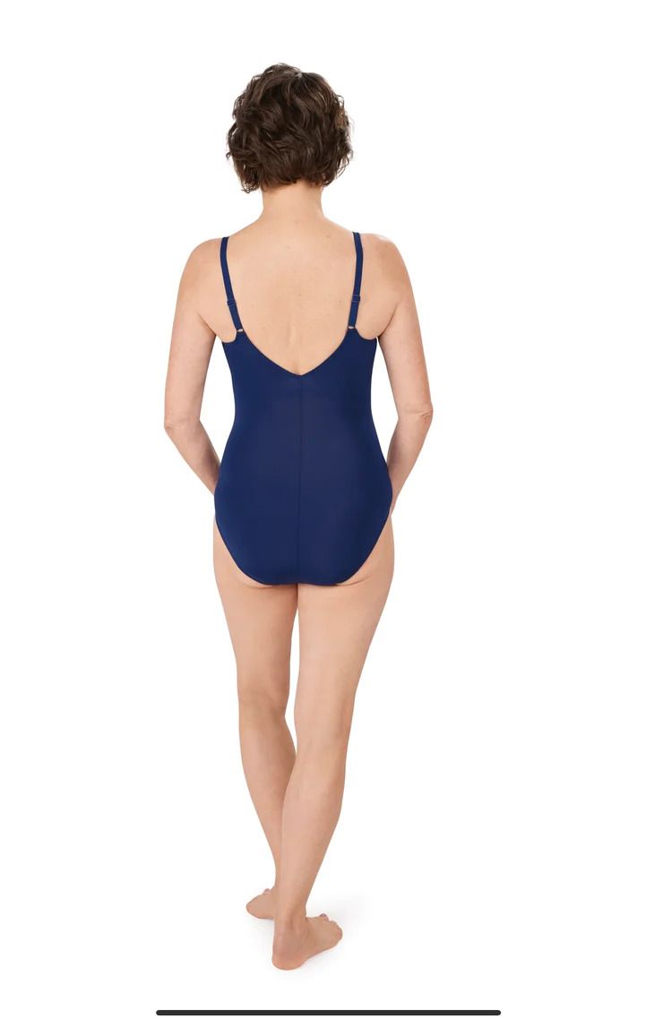 Едноделен ортопедски костим за капење со два билатерални џебови за протези во кои можете дискретно да ја вметнете протезата за гради.
