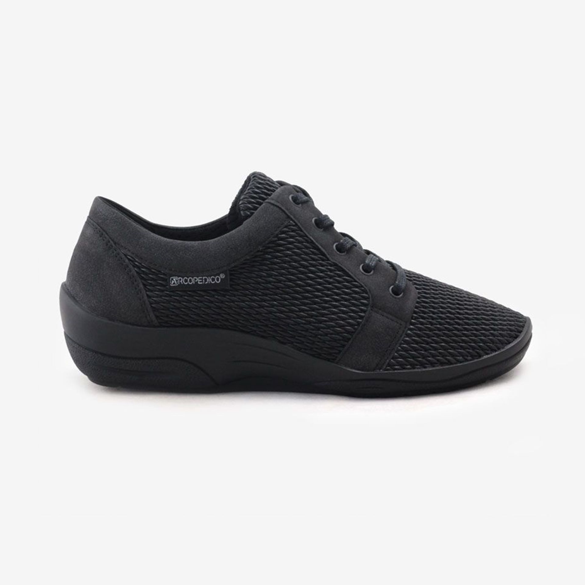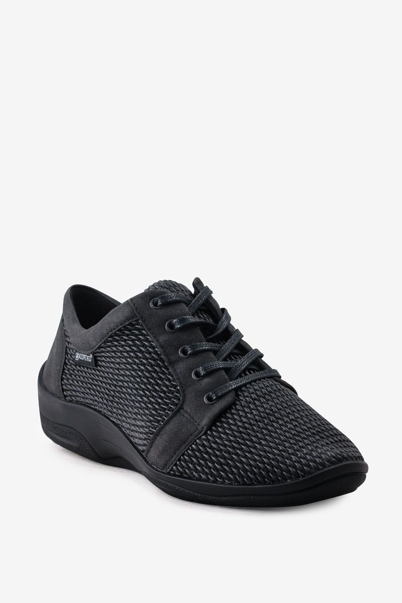 Црна спортска патика со врзување. Патиката има вградено анатомска влошка изработена од мемори пена. Обувката е ултра лесна и удобна за движење. Има гумен ѓон кој спречува лизгање и дополнителна поддршка во средишниот дел за поголема стабилност.