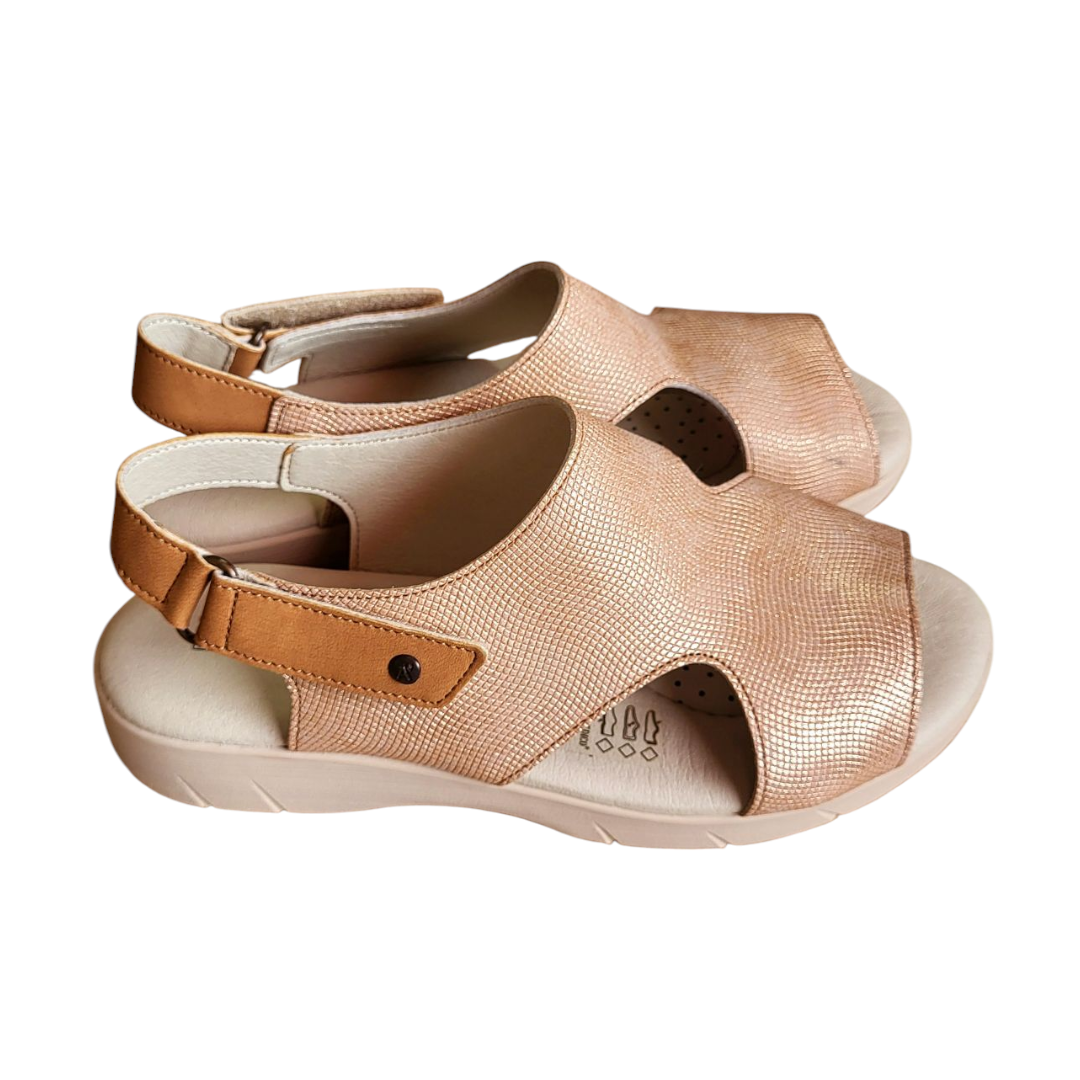 Сандали со едноставен дизајн кој лесно се комбинира со различни стилови, додека вградената ортопедска влошка од мемори пена обезбедува пријатно чувство при секој чекор. Закопчувањето во задниот дел е со лепенка, што овозможува брзо и лесно облекување и соблекување, особено за лица кои имаат тешкотии со класични обувки.