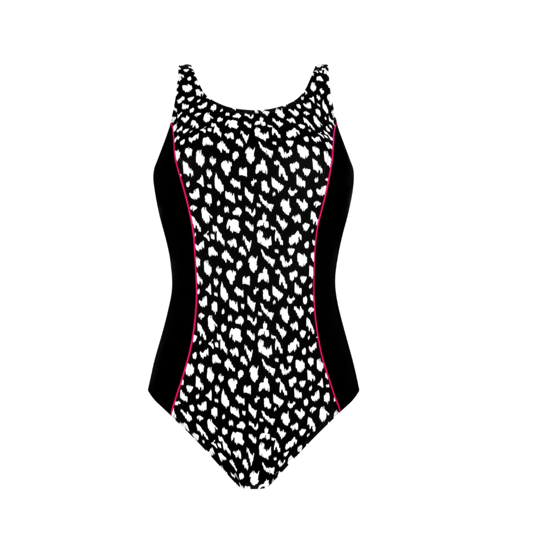 Едноделен ортопедски костим за капење со два билатерални џебови за протези во кои можете дискретно да ја вметнете протезата за гради.
