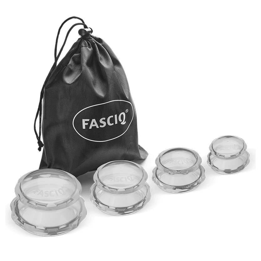 Силиконски сет за вакум масажа со 4 различни транспарентни чашки за целулит, спакувани во практична текстилна торбичка за складирање FASCIQ®.