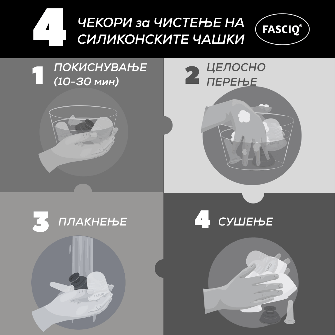 FASCIQ сетот за фацијално вакумирање е специјално дизајниран за третирање на лицето, вратот и деколтето. Комплетот за фацијално вакумирање доаѓа со практична торбичка за складирање и содржи 2 средни и 2 мини чашки за лице. Користењето на чашките истовремено овозможува професионална и рамномерна стимулација на фацијалната регија.