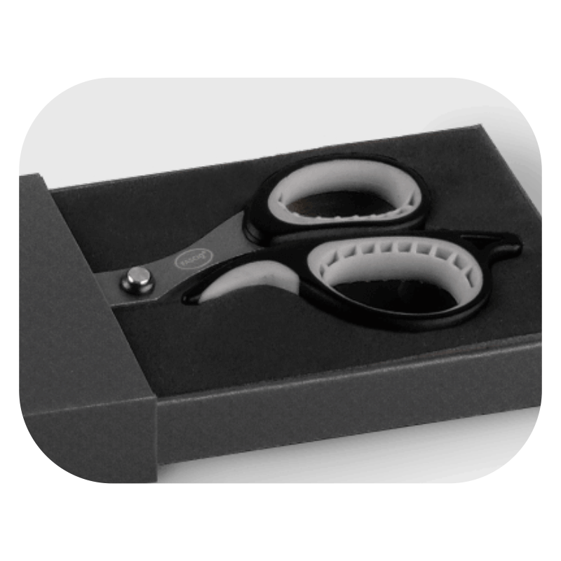 Професионални ножици наменети за прецизно сечење на кинезиолошки и атлетски ленти. Сечилата се обложени со тефлон кој спречува лепење на лепилото и овозможува мазно и лесно сечење. Изработени се од висококвалитетен јапонски нерѓосувачки челик кој обезбедува долготрајна острина и висока прецизност. Ергономските рачки со меко држење овозможуваат удобност при користење, додека лесната конструкција овозможува практична и едноставна употреба. Производот доаѓа со бесплатна крпа за чистење.