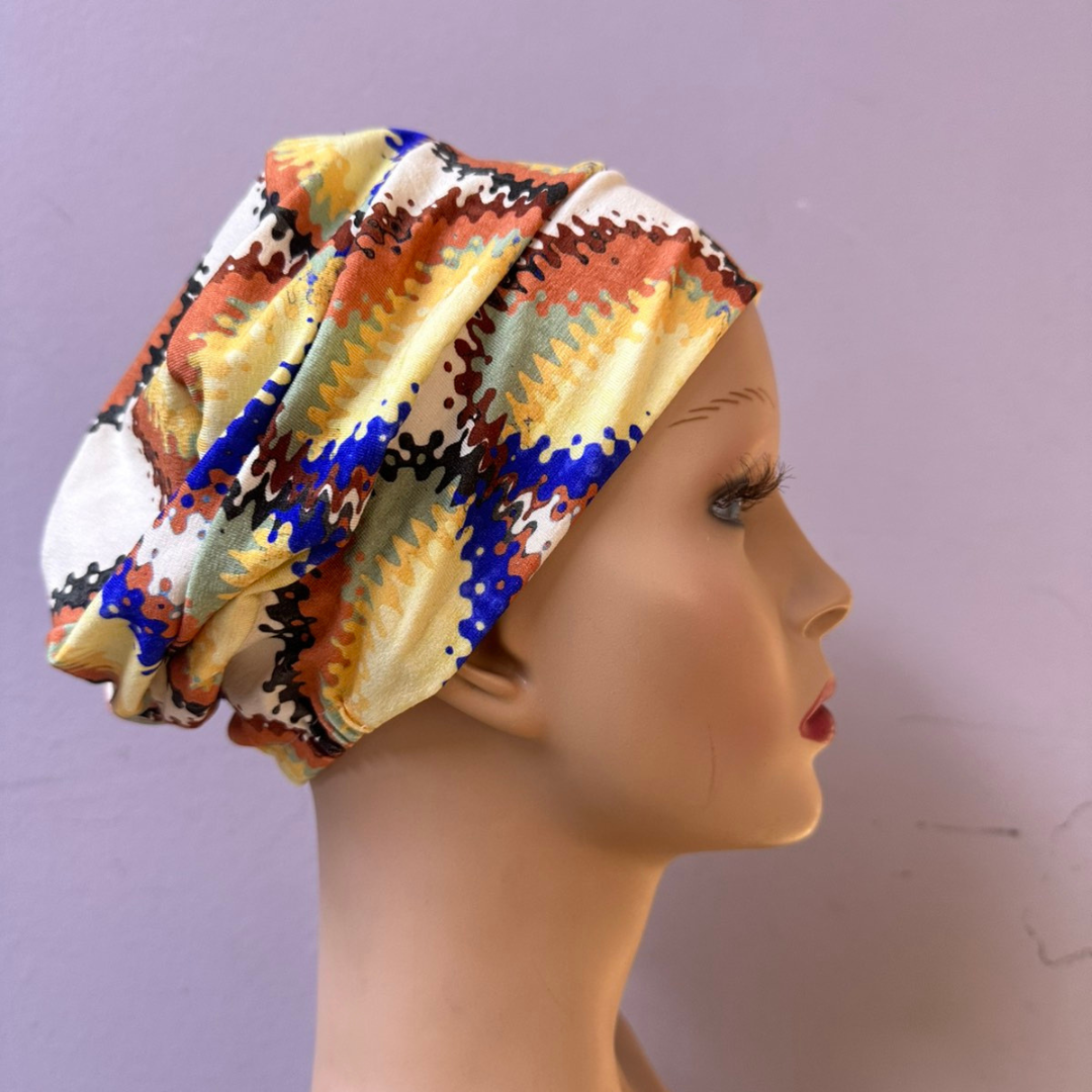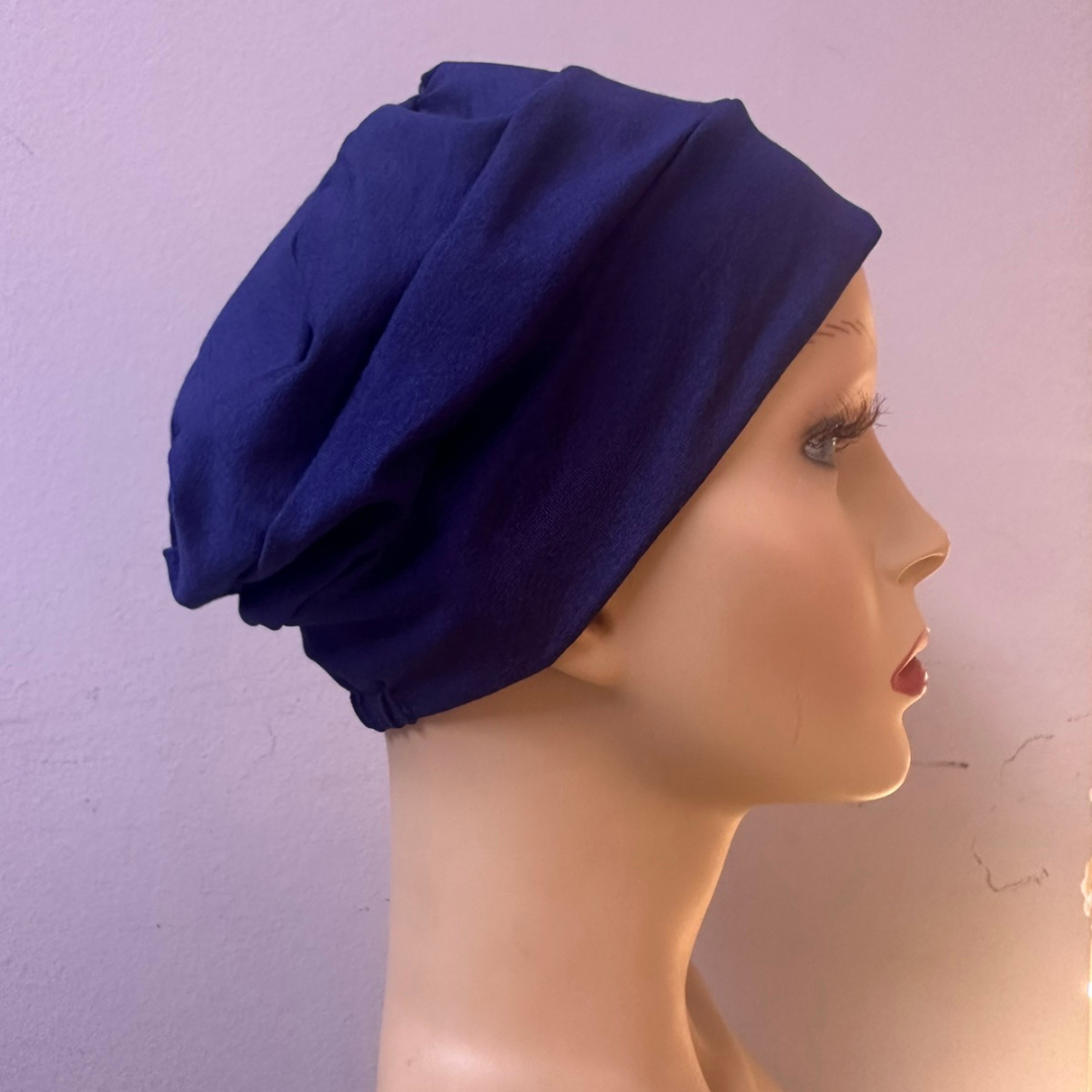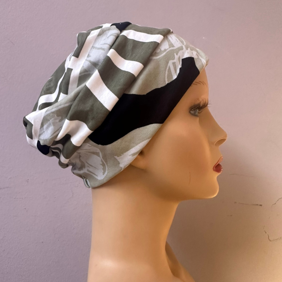 Турбан за глава изработен од мек материјал кој е пријатен и овозможува кожата да дише, што го прави удобен за носење во текот на целиот ден. Има хоризонтални набори а во делот на круната е поширок, што му дава модерен и едноставен изглед.Турбанот се прилагодува на формата на главата и не стега со што не ја иритира нежната кожа на скалпот.